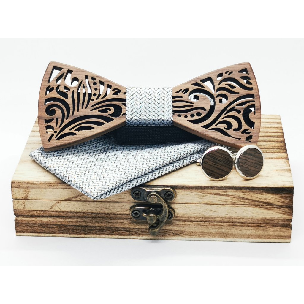 Tento luxusní set je ideální volbou pro moderního gentlemana, který hledá stylový doplněk pro slavnostní i formální příležitosti. Spojuje eleganci přírodního dřeva s klasickým textilním designem, čímž vytváří jedinečný a sofistikovaný vzhled.