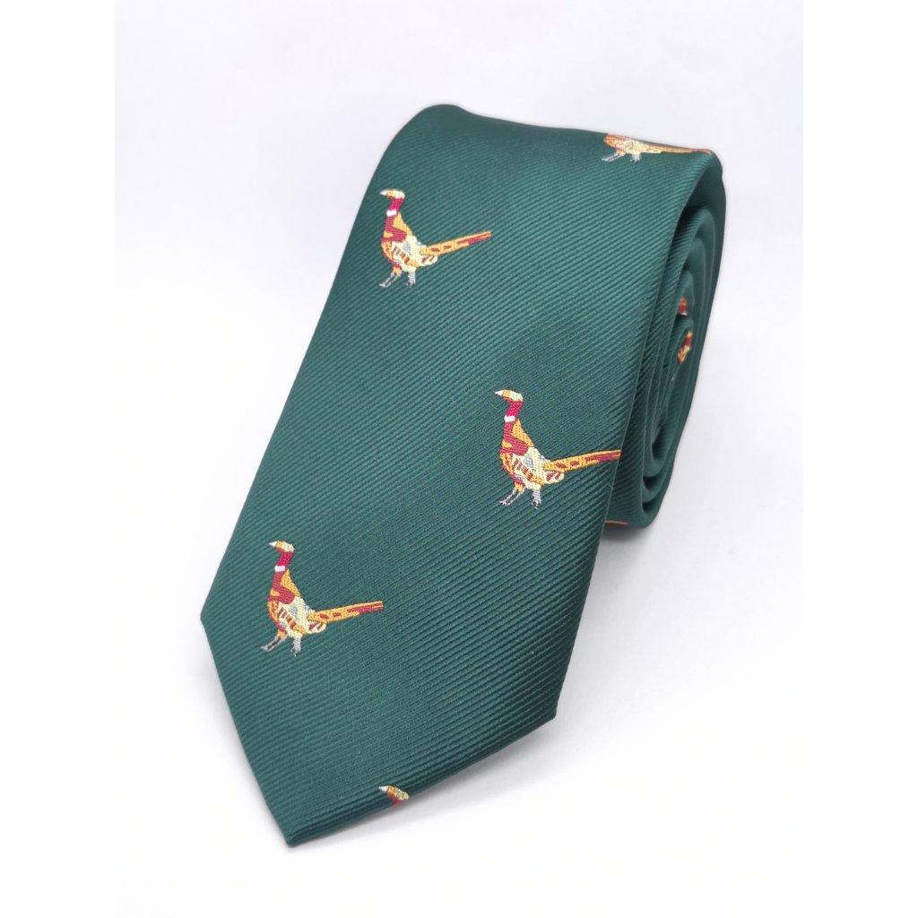Kravata zelená s bažanty v chodu