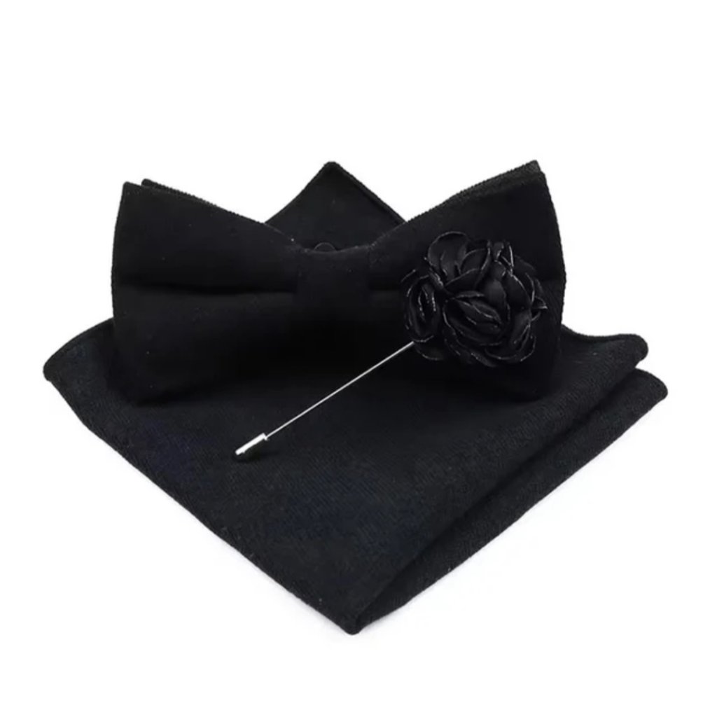 Motýlek má klasický tvar a je navržen tak, aby pohodlně držel a působil elegantně po celý den. Kapesníček perfektně doplní vzhled saka a dodá outfitu šmrnc. Stylová brož na klopu saka představuje jemný detail, který zvýrazní osobitý styl nositele.